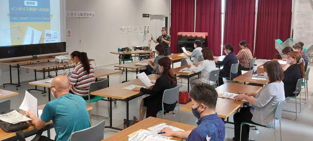 「インボイス制度説明会」(主催・沖縄宮古法人会)が28日、市未来創造センター研修棟で行われた。インボイス制度は2023年10月から始まる消費税の新ルール。税理士でフォルテシア総合会計事務所の高瀬智亨代表が参加した事業者や職員らに制度の内容などを説明した。