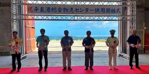 平良港に完成した「平良港総合物流センター」の供用開始式が1日、同所で行われ、関係者が物流拠点の本格稼働を祝った。センターは延べ床面積4020平方㍍、2階建て吹き抜け構造の物流倉庫。供用開始で市は物流機能の円滑化、スピーディーかつ効率化が促進されるとしている。