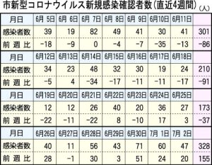 市は2日、市内での直近4週間の新型コロナウイルス新規感染確認者数を発表した。それによると6月26日から7月2日までの1週間の新規感染者数は328人となり、前週の173人を155人上回る大幅増となった。前週の人数を上回るのは7週間ぶりのことで、300人台になるのは3週間ぶりとなった。