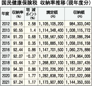 市の2021年度現年度分の国民健康保険税の収納率は、過去最高となっていた前年度の96・07%を1・17ポイント上回る97・24%となり過去最高を更新したことがこのほど、市国民健康保険課のまとめで分かった。ただし調定額が減少したことに伴い収納額は8817万円減の11億4435万円となった。滞納繰り越し分の収納率は年年度比6・38ポイント減の40・80%だった。