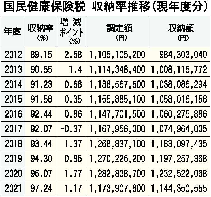 市の国保税現年度分の収納率は、13年度に90%台に達するとその後、17年度に前年度比0・37減となった以外は毎年度、上昇が続いている。89・15%だった12年度と比較すると21年度は8・09ポイント上昇している。