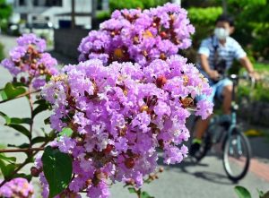 宮古の夏を代表する花の一つサルスベリ(ミソハギ科)が各地で見頃を迎え、いろいろな色の花が近くを行き交う人たちの目を楽しませている。
