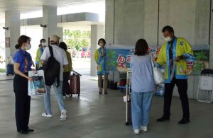 スカイマーク(SKY)の仙台-下地島線のチャーター便が9日、下地島空港に到着した。到着した乗客への歓迎セレモニーが行われ、航空機から降り立った162人の乗客に同空港関係者らから宮古島紹介のパンフレットなどが配られた。