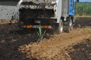 サトウキビの収量増を目指す市の地力アップ実証事業で12日、トラッシュ、バガス、糖蜜を混ぜ、3カ月間発酵させた有機肥料を平良久貝の畑にまいた。実証事業は今年度から3年間で、収量の変化や土壌分析などを行う。市では現在、平均反収5㌧程度の株出し栽培の収量を向上させるのが目的だ。