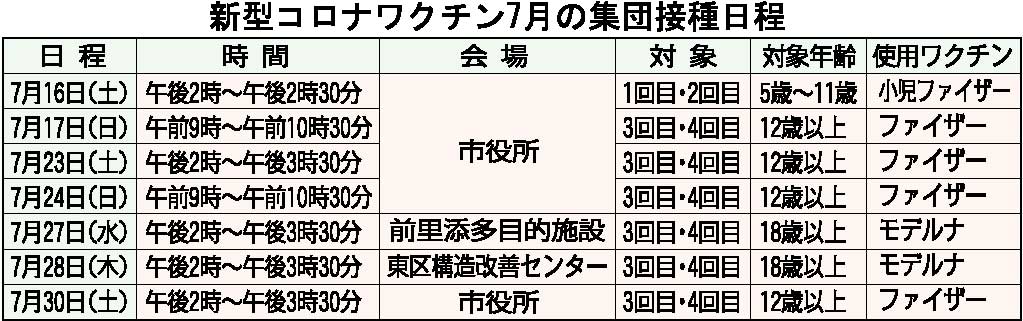 市による新型コロナウイルスワクチンの集団接種は、16日午後2時から同2時30分までは5歳から11歳の小児を対象とした1、2回目が、17日午前9時から同10時30分までは12歳以上を対象とした3、4回目が市役所で行われる。使用ワクチンはいずれもファイザー社製。市では接種予約を受け付けている。