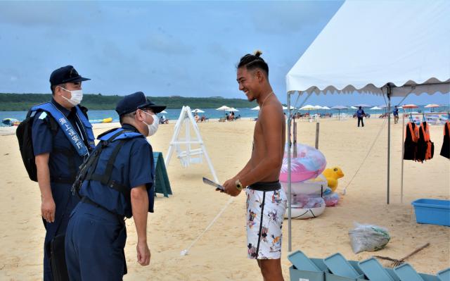 宮古島海上保安部、宮古島警察署、市水難事故防止推進協議会は16日、下地与那覇の前浜ビーチで水難事故防止などを目的に合同海浜パトロールを行った。同保安部の職員ら約10人が参加し、チラシなどを配布して海での事故防止を呼び掛けた。