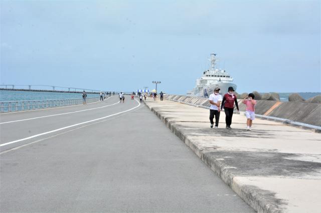 みなとフェスタ2022の一環である「クルーズ岸壁ウオーキング」(主催・市港湾課)が17日、平良港クルーズ船専用岸壁で行われた。新型コロナウイルス感染防止の観点から参加者を100人に限定。50人ずつの2回に分けてウオーキングを実施した。参加者は普段立ち入ることのできない往復約2キロの岸壁を歩き、景色を楽しんでいた。