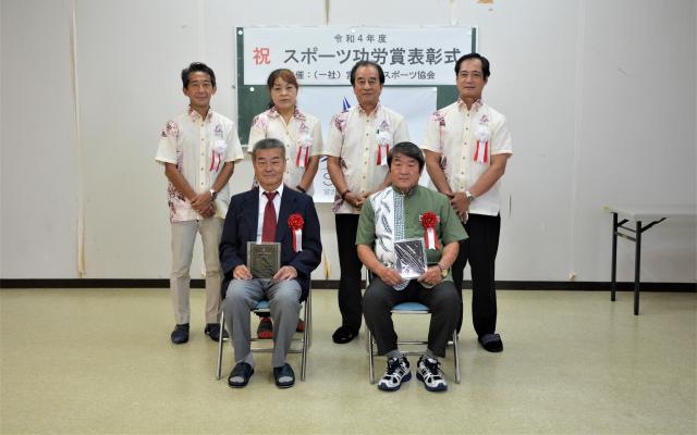 市スポーツ協会(砂川恵助会長)は17日、市総合体育大会で2022年度スポーツ功労賞2人を表彰した。砂川会長から、長年にわたり宮古スポーツ界に尽力し、その功績が顕著であるとして、我如古三雄さん、下地睦夫さんに表彰状が贈られた。下地さんは都合により、欠席し代理で根間康雄さんが受け取った。