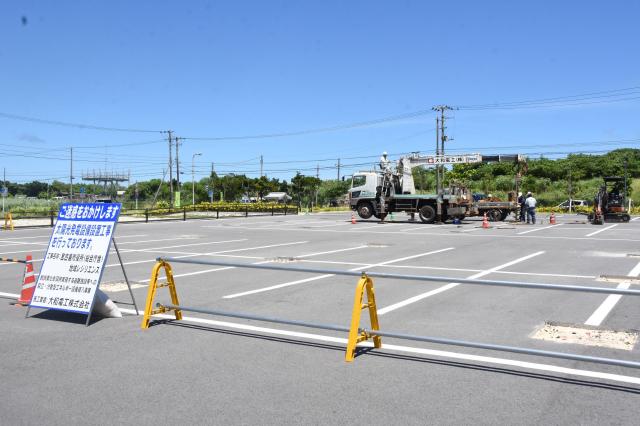 市が市役所庁舎内で使用する電気を発電する太陽光発電パネルを庁舎駐車場に設置する整備工事は21日、同パネルを敷き詰める架台の支柱基礎工事が行われるなど本格化している。庁舎東側の市民駐車場の一部が一時的に使用できなくなるため、市財政課では「市民にご迷惑をお掛けするが、ご協力をお願いしたい。東側には臨時駐車場もある」と理解を求めている。
