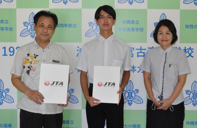 日本トランスオーシャン航空(JTA)は、琉球大学が実施している「琉球大学にぬふぁ星講座(医学部体験授業)」に参加する宮古高校1年の與那覇幹也さんと同2年の上地拓真さんに那覇-宮古間の往復航空券を贈った。21日、JTA宮古営業所の平良かおり所長が同校を訪れ、手渡した。