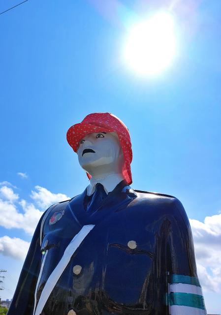 梅雨明け後、酷暑が続く今年の夏。天候、昼夜を問わず街頭に立ち続け、交通安全を呼び掛ける「宮古島まもる君」の活動もより一層厳しさを増している。そんな中、宮古電水前のまもる君には首もとの日焼け防止も兼ね備えた帽子がかぶせられ、少し雰囲気の違う姿が一服の清涼剤となっている。