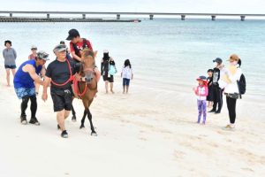 夏休み親子牧場体験in宮古島(主催・全国乗馬倶楽部振興協会)が26日、まいぱり宮古島熱帯果樹園などで行われた。市内から10組の親子が参加し、競馬解説者で沖縄在来馬に詳しい梅崎晴光さんから宮古馬の特徴や歴史などの説明を受けるとともに、前浜ビーチで乗馬体験を行った。