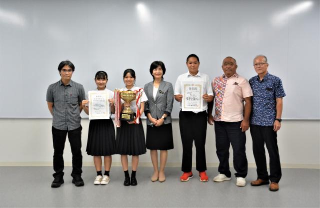 平良中学校(宮國幸夫校長)から陸上競技砲丸投げで全国と九州大会に出場する豊見山球真さん(2年)、九州大会に出場する吹奏楽部を代表して與那覇みなみさん(3年)と西里亜起歩さん(同)らが3日、市役所を訪れ、大城裕子教育長に意気込みなどを語った。豊見山さんは全国大会での予選突破を、吹奏楽部は全国大会出場を目指す。