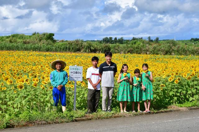 市市民運動実践協議会グリーン部会(平良耕次郎部会長)は3日、平良東仲宗根添(増原)の畑地でヒマワリの開花式を行った。部会員のほか、市職員らが参加。一周道路沿いに満開の花を咲かせたヒマワリ畑をPRした。見頃は旧盆までの1週間程度。