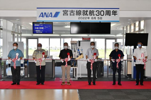 全日本空輸(ANA、本社・東京、井上慎一社長)の宮古島路線の就航30周年を祝う記念セレモニーが5日、宮古空港で行われた。式典にはANAの関係者や就航当時の制服を着た職員、座喜味一幸市長らも参加し、盛大に祝うとともに、関係者によるテープカットでは今後、同社と宮古島の観光振興のさらなる発展を祈念した。同社は1992年7月18日に大阪伊丹│宮古島線を皮切りに就航を開始した。