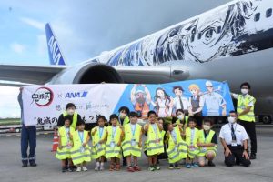 全日本空輸(ANA)宮古空港所(田之上圭克所長)は5日、宮古線就航30周年記念イベントとして、市立東保育所(川満めぐみ所長)の4歳児を招待して飛行機見学会を行った。園児8人が参加。子どもたちに人気の「鬼滅の刃」のキャラクターを機体に描いた「鬼滅の刃じぇっと」がサプライズで準備され、参加した園児8人が大喜びで記念撮影に収まっていた。