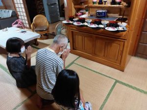 平良下里の砂川芳彦さん(78)宅では旧盆初日に孫が訪れ、仏前で線香をたいて先祖の霊を迎え仏壇に手を合わせた。芳彦さんは「コロナの影響で寂しいお盆だが仕方ない。家族が健康で毎日楽しく過ごせるよう先祖に祈りたい」との思いを述べた。