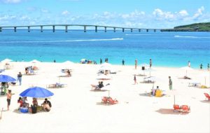 お盆休みを宮古島で過ごそうと、観光地やビーチは観光客でにぎわった。新型コロナウイルス感染収束が見通せない中、3年ぶりに制限行動のないお盆。天気にも恵まれた13日は、伊良部大橋を走るレンタカーが連なった。前浜ビーチでは海水浴や水上スキーなどで楽しむ家族連れが多く「宮古といえばやはり海」と口をそろえた。抗原検査やマスク着用、食事はスーパーで買い出ししホテルの部屋で取るなど、移動先での感染対策の徹底も実践していた。