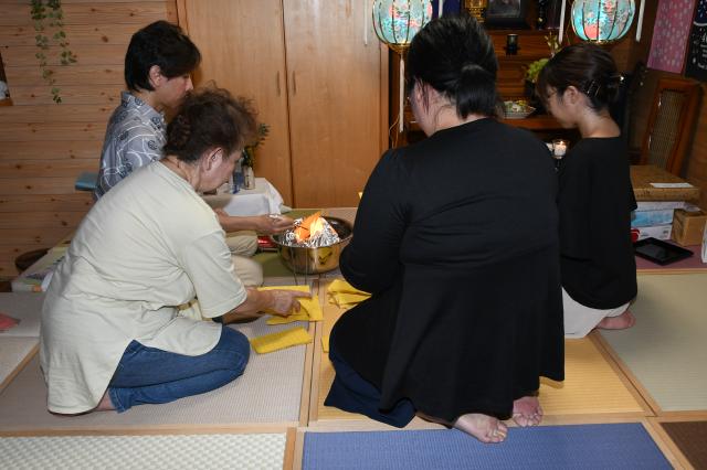 旧盆最終日の12日は、亡くなった人たちの世界とされる後世(グソー)から旧盆初日の10日に迎えた先祖の霊を後世に送り出す「送り日」。各家庭では集まった家族らが、先祖のために後世のお金とされる打ち紙(紙銭)を焼いた後、焼いた打ち紙と供え物をアルミホイルで包み、庭先などで手を合わせて送り出すとともに、向こう一年間の無病息災などを願った。