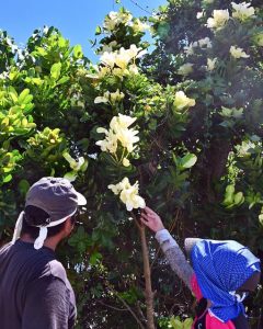 上野の道路沿いにあるテリハボクの一部の葉が本来の緑色ではなく、白くなって大きな花のように見えることから、道路を行き交う人たちの注目を集めている。