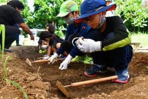 宮古の歴史文化に触れてもらおうと、市教育委員会(大城裕子教育長)は17日、夏休み体験学習「発掘調査体験」を旧仲宗根家で初開催した。参加した小学生8人が調査道具で土を掘り、陶器のかけらや貝殻などの遺物を発見。遺物の洗浄や復元の工程も体験した。約700年前と見られる陶磁器のかけらなど300点が出土した。