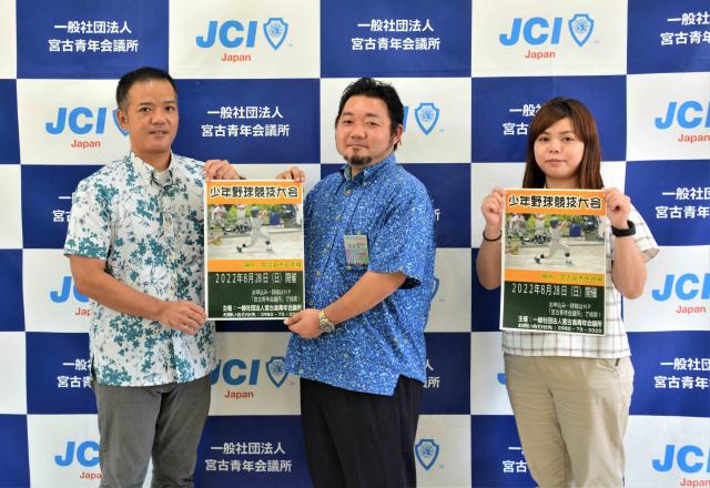 第42回JC杯少年野球大会が9月17、18日に市民球場などで開催される。高学年、低学年の部に分かれて、「一志団結」をスローガンにトーナメントで争う。開催は3年ぶり。主催する宮古青年会議所(JC)の、新城竜太同大会実行委員長、新崎亮太専務理事が24日、同会議所で記者会見し、実施要項などを発表した。大会前の28日には初の試みとして、遠投や塁間走のタイムなどを競う少年野球競技大会を市民球場で行う。