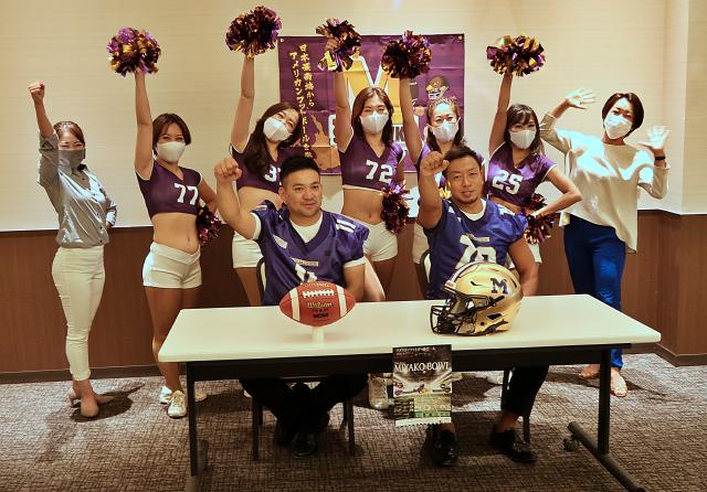 宮古島初のアメフトの試合に多くの来場を呼び掛ける高見沢代表(手前右)とシーホークスの高良暁キャプテン(手前左)=25日、JAおきなわ虹のホールみやこ
