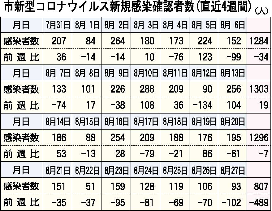 市は27日、市内での直近4週間の新型コロナウイルス新規感染確認者数を発表した。それによると8月21日から27日までの1週間の新規感染者数は807人となり、前週の感染者数を489人下回る大幅減となった。週間感染者数が1000人以下となるのは6週間ぶりとなる。
