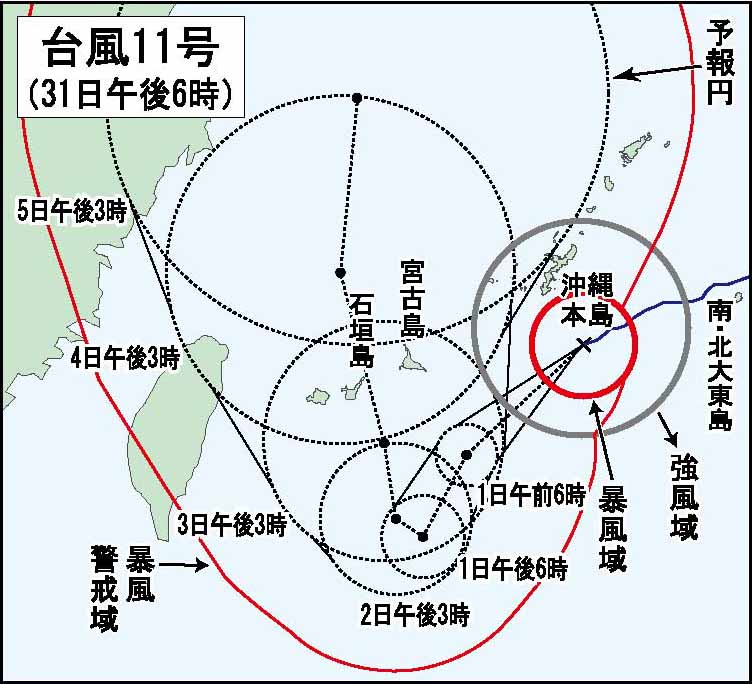 気象庁によると31日午後6時時点での台風11号の中心気圧は920ヘクトパスカル、中心付近の最大風速は55㍍、最大瞬間風速は75㍍で、中心から半径95㌔以内では風速25㍍以上の暴風が、中心の北側220㌔以内と南側165㌔以内では風速15㍍以上の強風が吹いている。