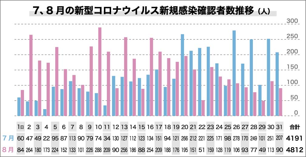 8月の感染状況を日ごとに見ると、感染者数が2桁だった日は8日間、100人から150人が6日間、151人から200人は9日間、201人から250人は4日間、250人以上が4日間だった。