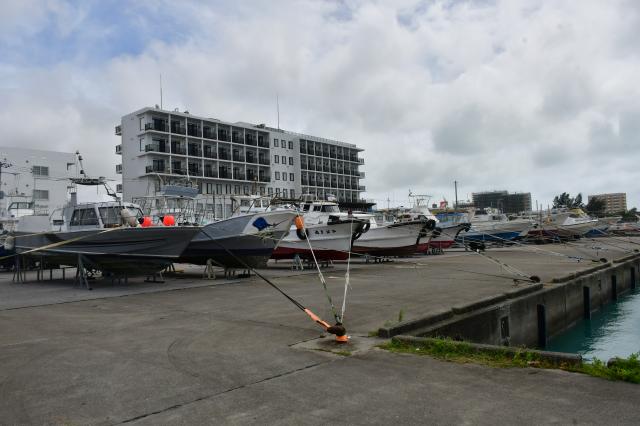 遊漁船などは陸揚げされ、ロープで固定されていた=2日、平良港下里船溜まり(布干堂)