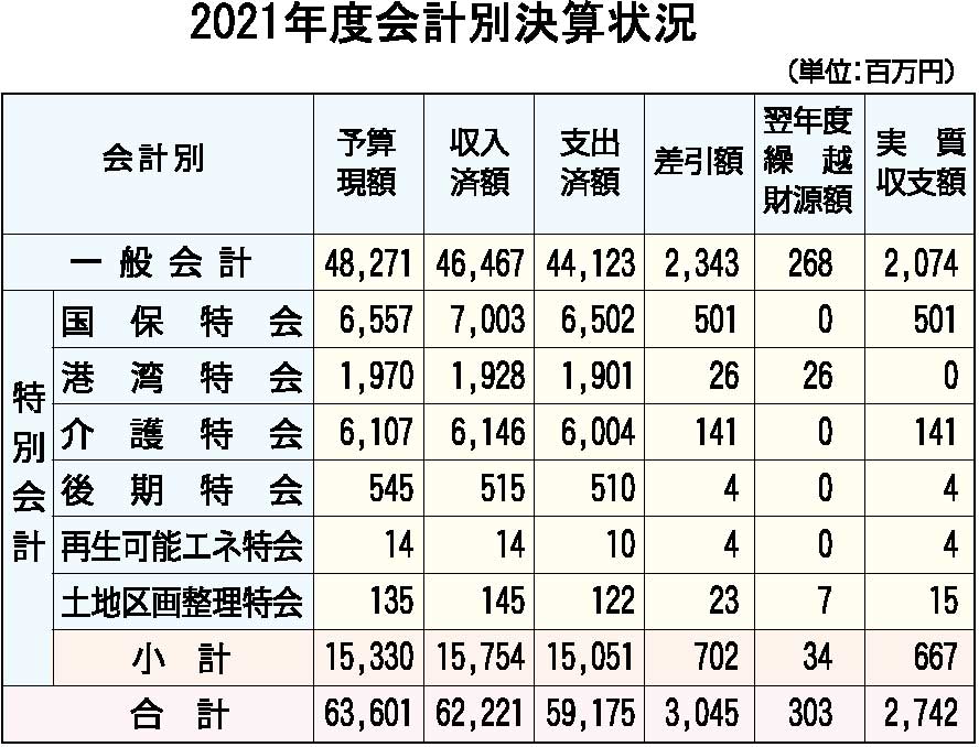 実質収支20億7400万円の黒字/市21年度一般会計決算