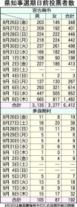 8日から「三日攻防」に突入した県知事選挙。宮古では、先週まで前回を上回っていた期日前投票数が、台風11号が通過して以降伸び悩んでいる。2週間目となる8日現在では6412人が投票を済ませたが、前回4年前同期の1万704人に比べて59・90%と落ち込んでいる。一方で、8年前の前々回の5768票に比べて11%増となっている。