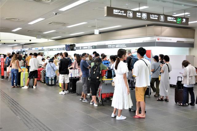 宮古空港では、あすからの欠航を前に予定を変更して、帰路に就く観光客らで混雑していた。