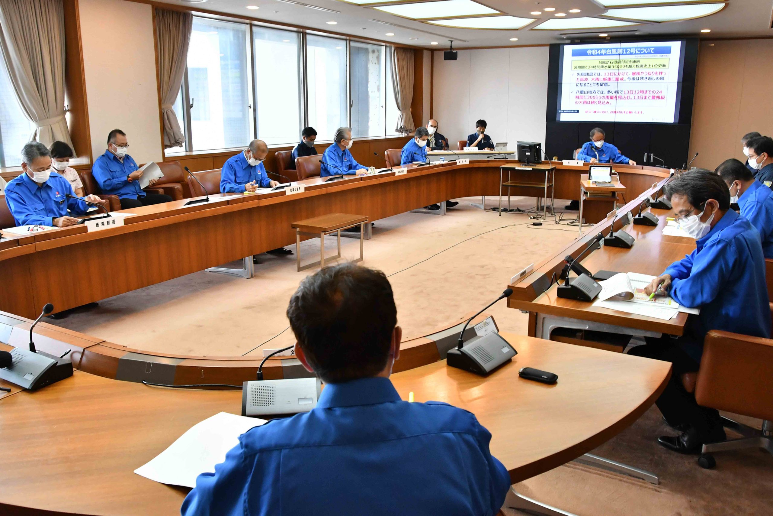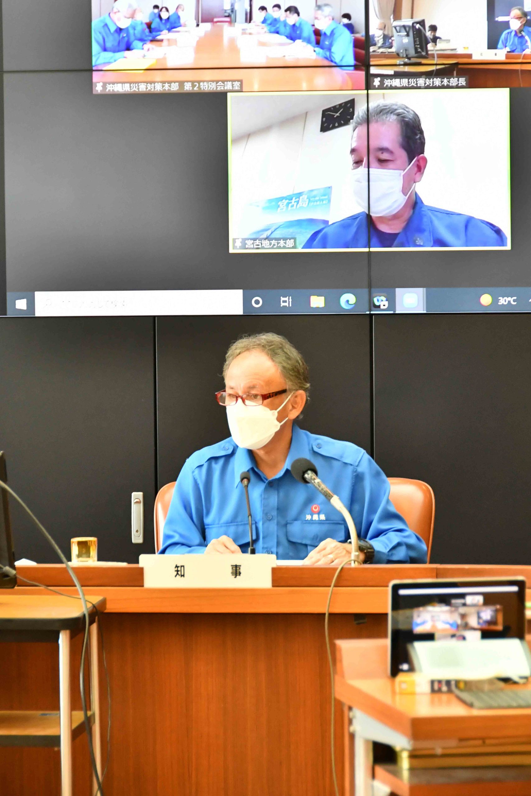 台風12号が接近しているため、県は12日午後1時半から県庁と各地域をオンラインで結んで災害対策本部会議を開催した。宮古島地方には12日夕方に最接近するとの見通しが報告され、玉城デニー知事は「台風が接近している間は、不要不急の外出は控えてほしい。畑や漁船、海の様子を見に行くといった、危険な場所に近付く行動は、絶対にやめてほしい」などと呼び掛けた。