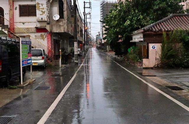台風12号の接近で強い風雨となった12日の宮古島。普段は土産品を買い求める観光客や居酒屋に訪れる人たちでにぎわう西里通りもこの日は、ほとんどの店舗のシャッターは閉められたままで、人通りもなく閑散としていた。
