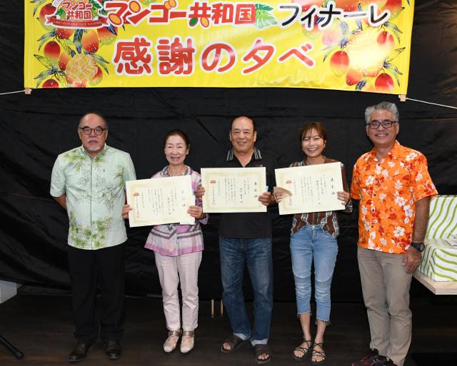 今年は6月11日から8月28日までの期間に「建国」されていた「マンゴー共和国」の2022年フィナーレとなる「感謝の夕べ」が10日、島の駅みやこで開かれた。好成績を残した生産者への表彰が行われ、ベストオブザイヤー賞が長立ファームに贈られた。今年の期間中の合計販売額は1億1692万円となり前年実績を1272万円上回った。