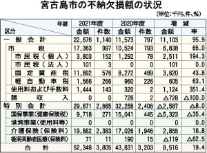宮古島市の2021年度一般会計における不納欠損は件数で1140件、金額にして2267万6556円となり、前年度に比べ件数で343件、金額で1110万3440円増加したことが同年度歳入歳出決算書で分かった。1140件のうち市税が997件(1736万3846円)で、その中で件数が最も多かったのは固定資産税だった。市監査委員は、税負担の公平性を確保する観点からも、不納欠損に陥らないよう引き続き効果的な徴収対策を図るよう求めている。