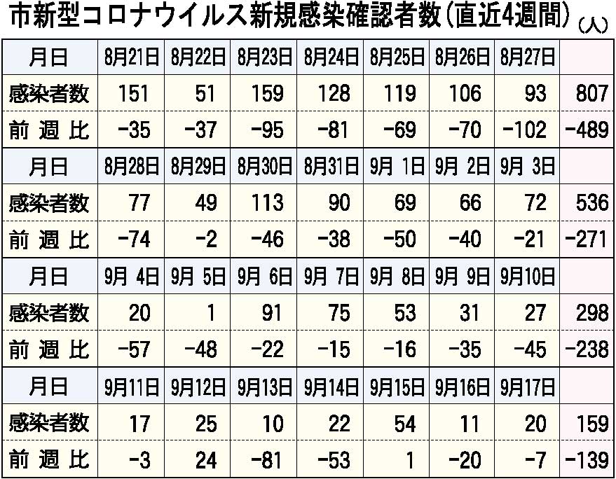 市は17日、市内での直近4週間の新型コロナウイルス新規感染確認者数を発表した。それによると9月11日から17日までの1週間の新規感染者数は、前週比で139人の減となる159人だった。前週の感染者数を下回るのは5週連続となり、週間感染者数が100人台となるのは12週間ぶりとなる。