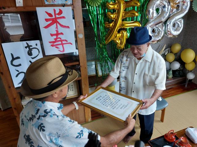 池間自治会(仲間広二会長)は19日、「敬老の日」にちなみ、自治会役員らが対象世帯の1軒1軒を訪ねて回り、赤飯や酒、菓子を振る舞った。例年、敬老会の会員やその家族、スタッフらを交えて盛大に敬老会を開催するが、新型コロナウイルス感染症の影響で3年連続で敬老会は中止となった。