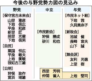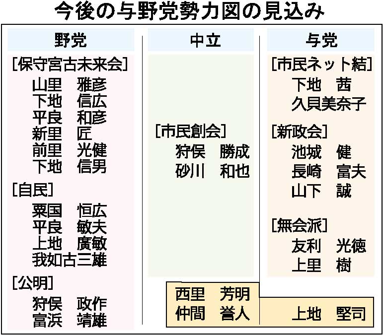 市議会の与野党勢力図が変化する見通しが強くなった。現在の勢力図は定数24人に対して与党10人、野党12人、中立2人の構図だが、座喜味一幸市長を支える与党の「ワンチームみゃーく」勢力は、参議院選、知事選挙における足並みの乱れも影響して、今後の勢力は2人減って8人に、それを受けて中立が2人増の4人となり、野党は現状の12人を維持する見込みだ。