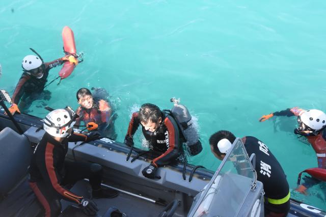 宮古島海上保安部(福本拓也部長)と市消防本部(宮國和幸消防長)の合同潜水訓練が21日、平良港第4埠頭(ふとう)で行われた。海保から巡視船「はりみず」の潜水士4人を含め17人、消防からは水難救助隊員11人ら15人が参加し、合同での捜索訓練などを通して海難救助の連携を深めた。