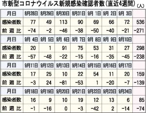 市内の週間感染者数は7月17日から23日の週より5週連続で1000人台が続いていたが、8月21日から27日の週に前週比489人減の807人と1000人台を割り込むと、その後は536人、298人、159人と前週を大幅に下回る減少傾向が続いてきた。