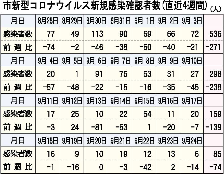 市は24日、市内での直近4週間の新型コロナウイルス新規感染確認者数を発表した。それによると9月18日から24日までの1週間の新規感染者数は、前週比74人減の85人となり、26週間ぶりに週間感染者数が100人を下回った。前週の感染者数を下回るのは6週間連続となる。