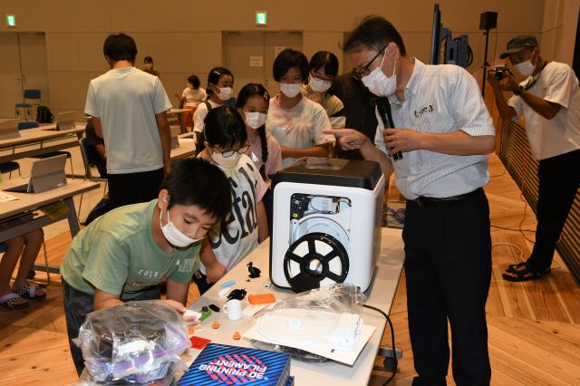 子どもたちがテクノロジーに触れるイベント「ミヤコキッズイノベーション! 3Dプリンターでオリジナルキーホルダーを作ろう」(主催・ミャーテック)が24日、市未来創造センター多目的ホールで開かれた。参加者たちは兵庫教育大学学校教育研究科の森山潤教授から3Dプリンターの仕組みを学び、同プリンターで作るキーホルダーのデザイン作成に挑戦した。
