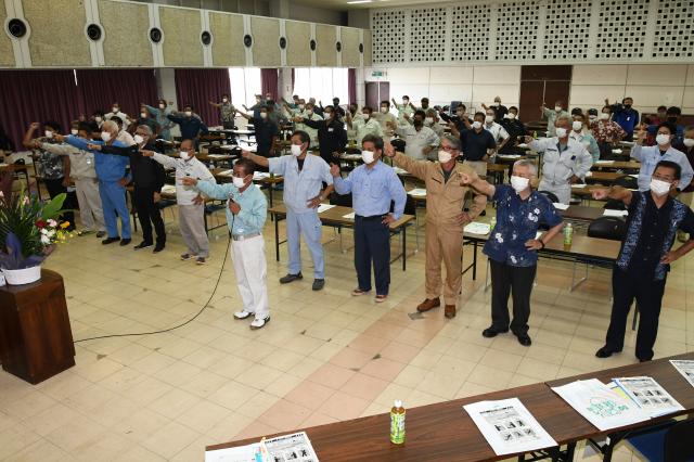 10月1日から全国労働衛生週間が始まるのを前に、2022年度宮古地区労働衛生大会が27日、JAおきなわ宮古地区本部大ホールで開かれた。関係事業所の社員らが参加し、「健康確保対策と職場環境の改善を進め、誰もが安心して健康に働ける職場を築いていく」などとする大会宣言を採択したほか、同週間のスローガンを指さし呼称で読み上げ確認した。