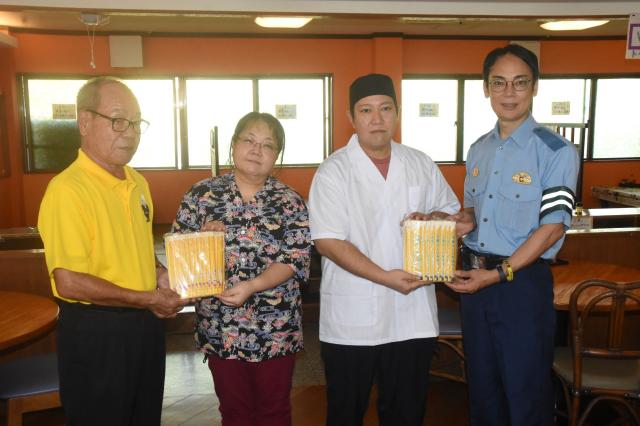 宮古島警察署(仲宗根宗信署長)の交通安全箸渡し作戦が28日、市内の飲食店など16店舗で行われた。仲宗根署長ら署員と宮古島地区交通安全協会(友利勝一会長)、地域交通安全活動推進委員ら約25人が、宮古島まもる君がデザインされた割り箸1万膳を配布し、交通安全に向けて交通ルール順守を呼び掛けるよう協力を求めた。
