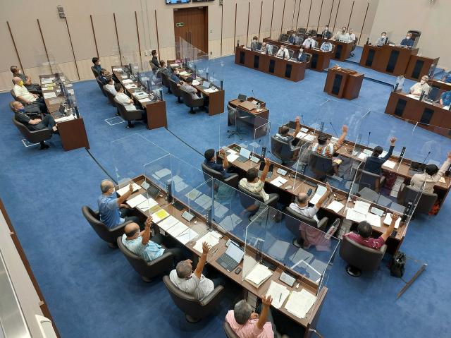 政策参与報酬などが含まれた2022年度一般会計補正予算案が29日、市議会(上地廣敏議長)の最終本会議で原案通り可決された。前日に同案を否決し、新たに政策参与報酬を削除した修正案を可決した総務財政委員会とは異なる結果となった。採決では、保守系ということもありこれまでは野党に同調する行動が見られた中立会派の2人が、今回は与党寄りの原案に賛成した。
