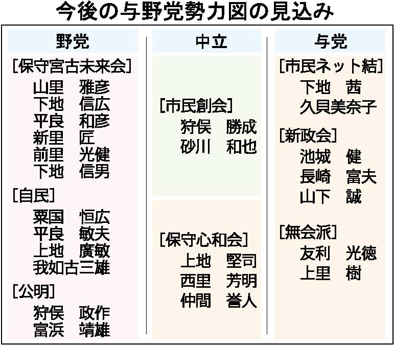 革新勢力と一部保守勢力で構成する座喜味市長を支える与党の「ワンチームみゃーく」は、参議院選、知事選挙における足並みの乱れも影響して、選挙後は内部で不協和音が生じていた。