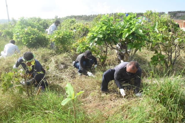 美ぎ島宮古グリーンネット(会長・座喜味一幸市長)の第82回活動が29日、城辺西東地区の一周道路近くで行われた。2022年度の一回目となる活動には、建設会社や市、県などグリーンネット会員ら130人が参加し、2015~17年の活動で計1860平方㍍に植樹したテリハボクなど1777本を対象にした育林作業として下草刈りを行った。